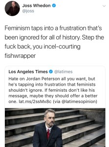 Joss Whedon Attacks Jordan Peterson June 7, 2018 / The pathetic howl of the mangina-exposed-as-hypocrite in action. Read more at The Daily Caller. Share this: Click to share on X (Opens in new window) X Click to share on Facebook (Opens in new window) Facebook Like Loading... Related