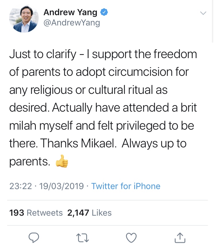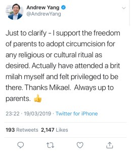 However, his message (though timid perhaps for readers of J4MB) has the power to radically shift the conversation in the U.S. and save boys from being cut. Furthermore, in an interview with The Daily Beast, Yang confirmed that: “I’m highly aligned with the intactivists. History will prove them even more correct.”
