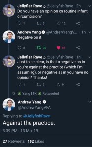 Democrat presidential candidate, Andrew Yang had the above exchange on Twitter last week. When pressed, he clarified:
